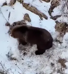 Drone de resgate flagra urso recém-saído da hibernação brincando na neve na Estônia
