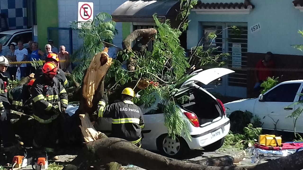 A árvore despencou sobre um carro Chevrolet Celta branco, onde estava uma mulher. O carro ficou destruído, conforme você pode ver nas fotos da galeria.