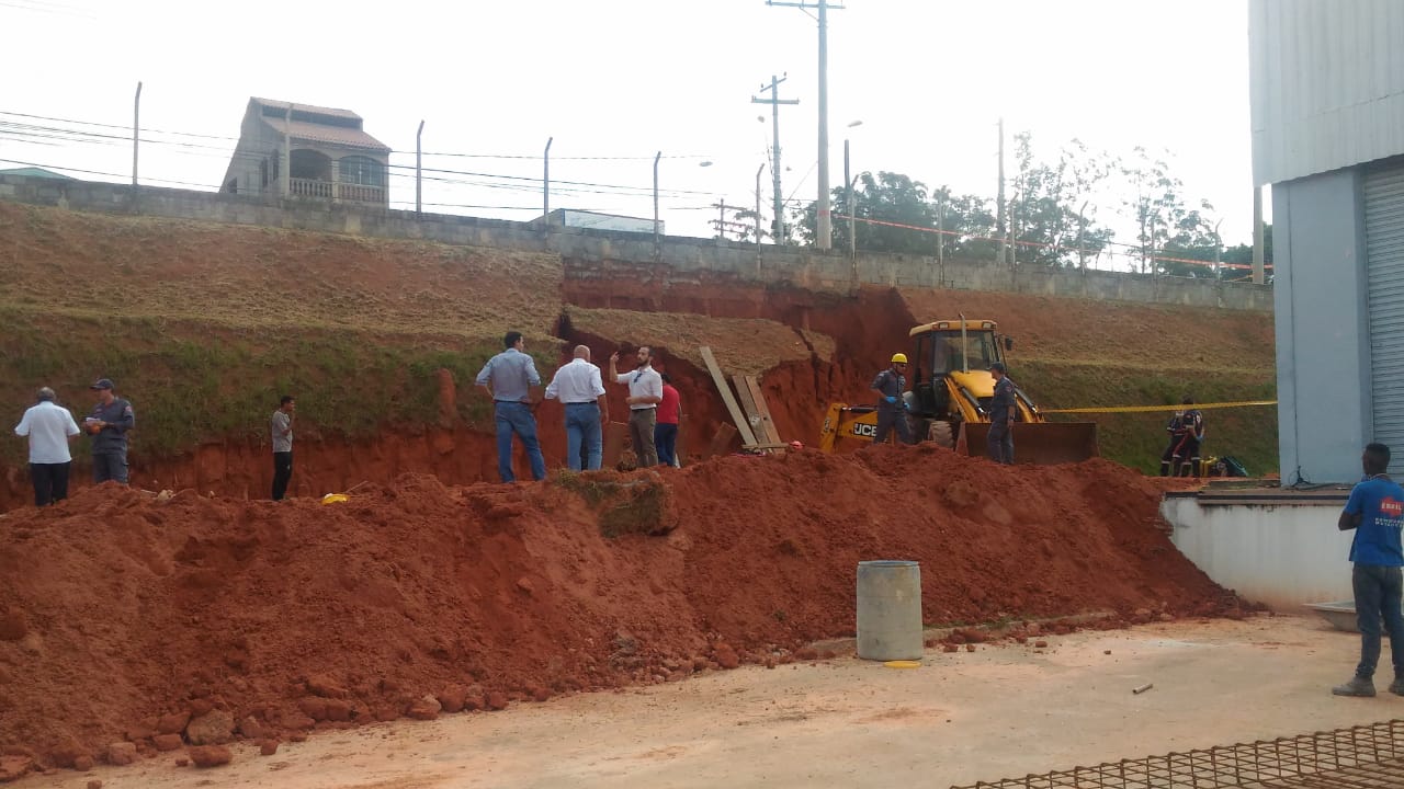 Ontem (9), houve um deslizamento de terra em um barranco que fica no fundo e um galpão de uma empresa. No local, operários trabalhavam na construção de um muro de arrimo.