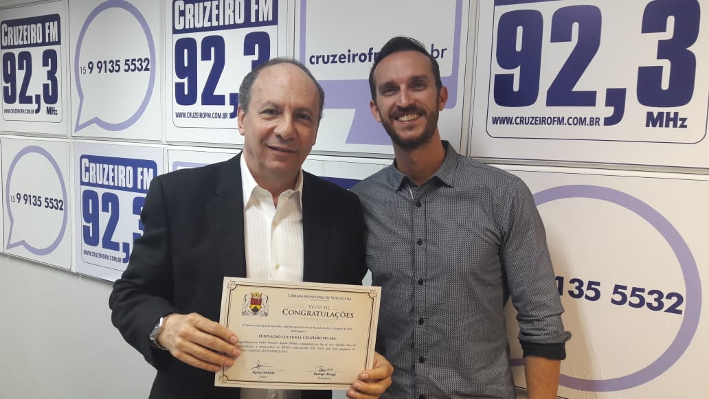 O Voto de Congratulações foi proposto pelo vereador Rafael Militão (MDB) e aprovado em sessão pelos demais parlamentares do Legislativo sorocabano. Nesta quarta-feira, dia 4, o vereador esteve nos estúdios da Cruzeiro FM, participou do Jornal da Cruzeiro 2ª Edição e entregou o Voto de Congratulações ao empresário Alexandre Latuf, que é o presidente da Fundação Cultural Cruzeiro do Sul, mantenedora da rádio Cruzeiro FM 92,3, número um em jornalismo.