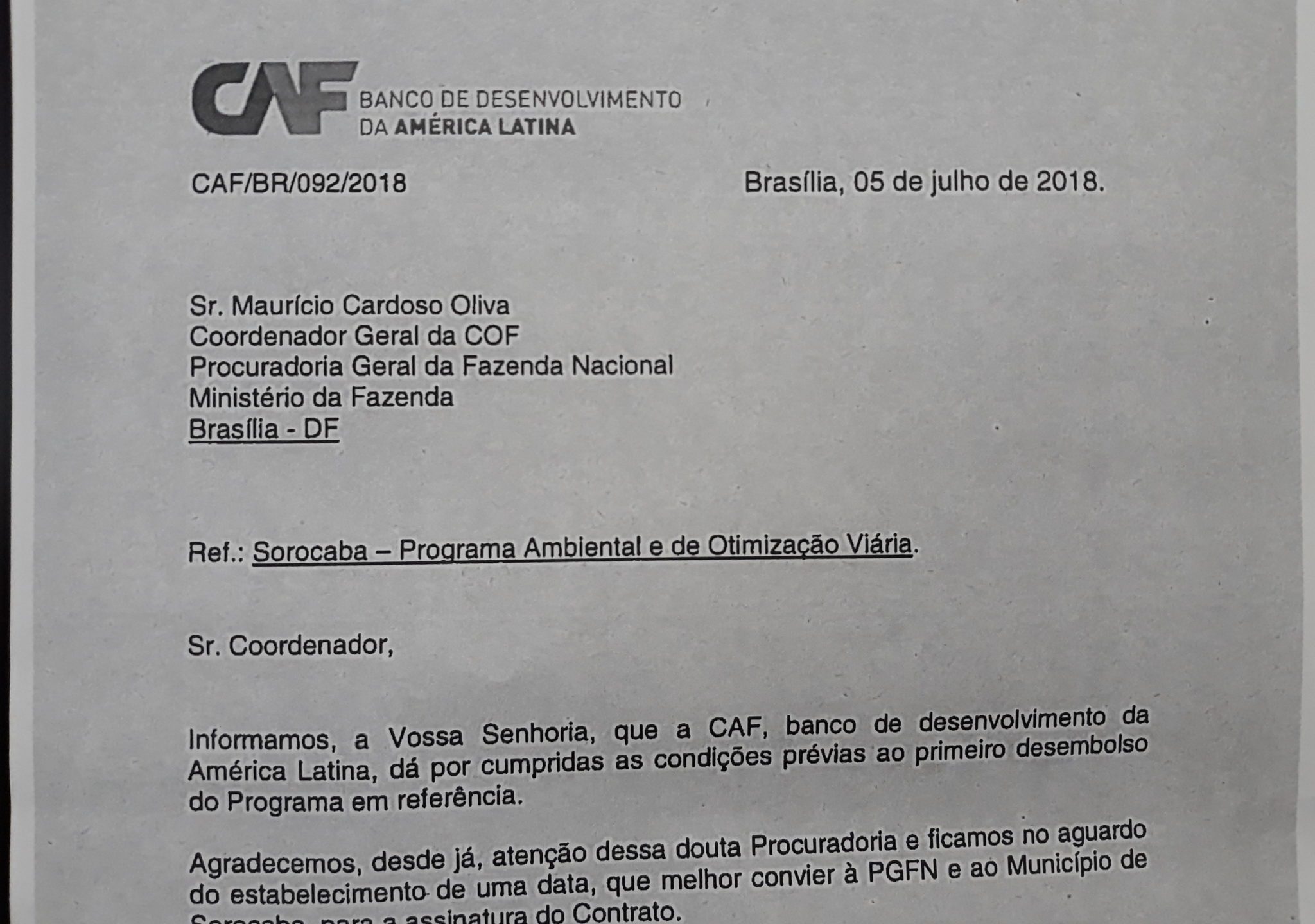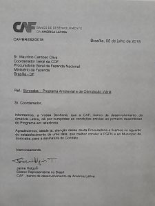 Veja o documento assinado por Jaime Holguín, diretor representante do CAF no Brasil: