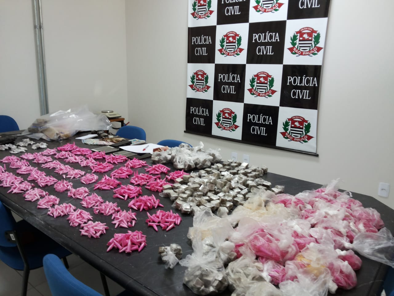 Foram apreendidos ainda cerca de seis mil pinos de cocaína e quatro tijolos de maconha, com aproximadamente quatro quilos cada.