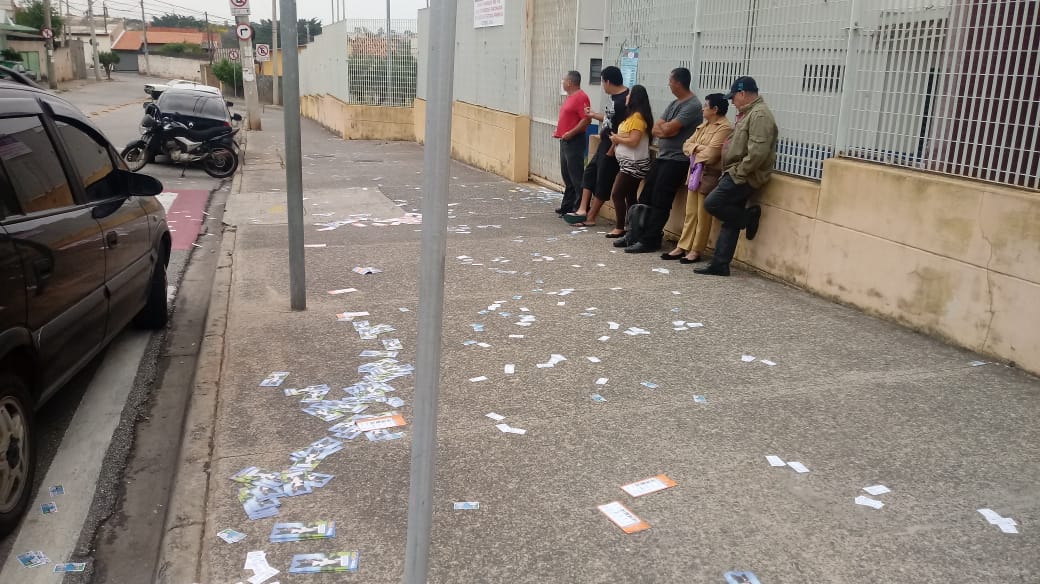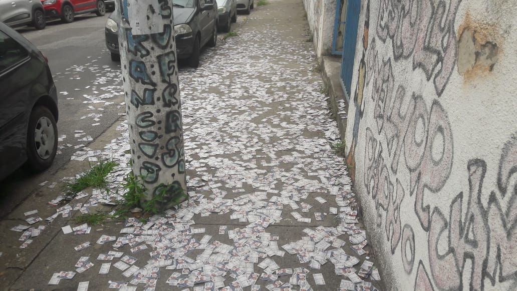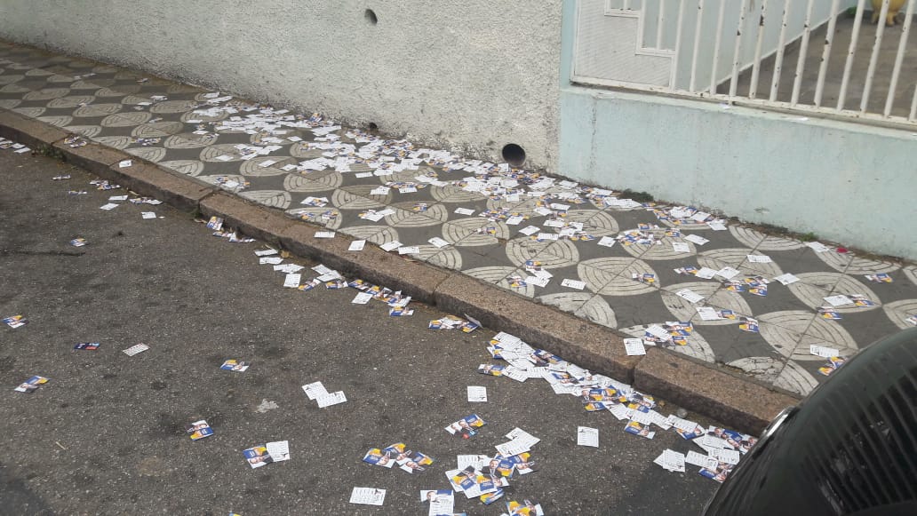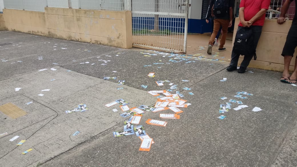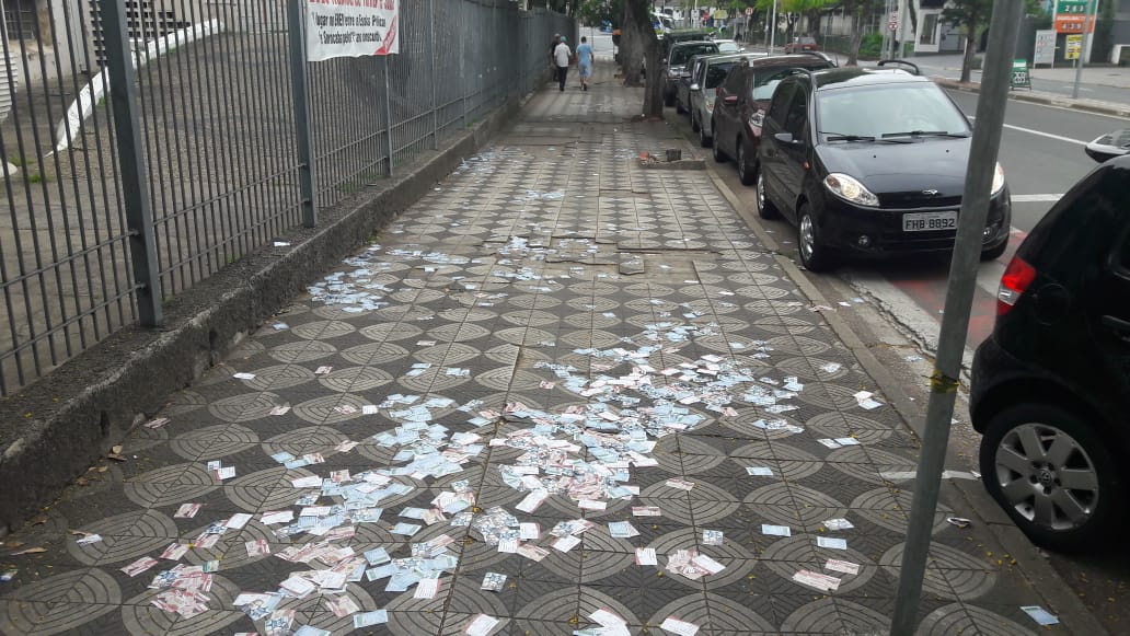 - Santinhos espalhados no entorno da Escola Estadual Antonio Padilha