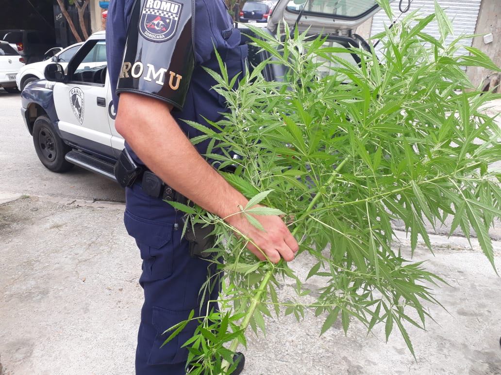 A ROMU foi até o local na Vila Barão apontado pelo casal, onde de imediato foi identificado no portão da residência, um pé de maconha de aproximadamente um metro na garagem. Ao notar a chegada da equipe, o indivíduo indicado pelo casal, posteriormente identificado como E.M.S, de 43 anos, já possuía antecedentes criminais, tentou se desfazer de um aparelho celular pela janela dos fundos.