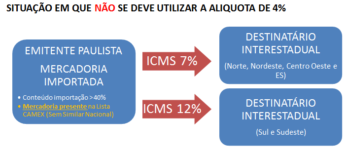 A alíquota interestadual de 4% foi estabelecida após a promulgação da Resolução do Senado Federal nº 13/2012 e deve ser aplicada, regra geral, nas operações interestaduais com bens e mercadorias importados do exterior com conteúdo de importação superior a 40%. No entanto, esta alíquota reduzida não deve ser utilizada nos casos em que as mercadorias comercializadas não tenham similar nacional e estejam em lista definida pelo Conselho de Ministros da Câmara de Comércio Exterior (CAMEX).