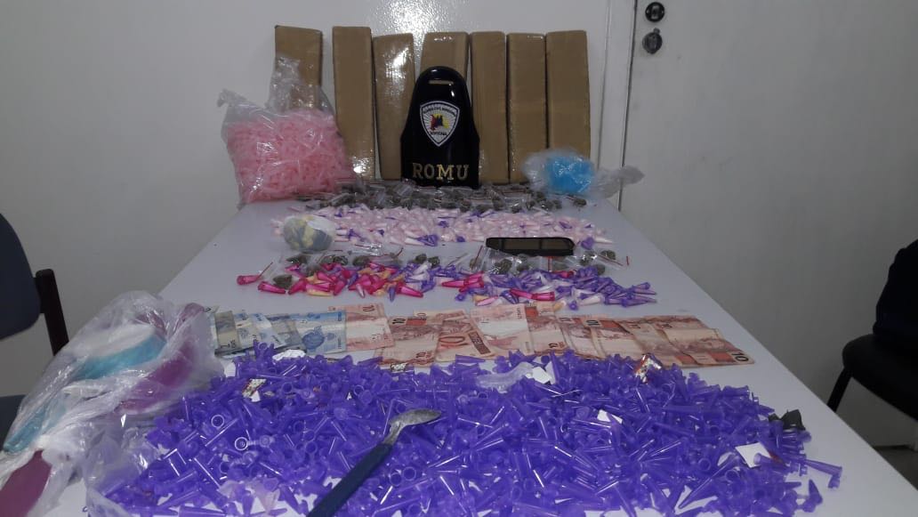 Já no local, a Romu constatou que a porta do imóvel estava aberta e uma bolsa estava em cima do sofá, onde os guardas encontraram mais 258 porções de cocaína, uma porção a granel da mesma droga, 86 porções de maconha e mais sete tijolos também de maconha, bem como um vasto material para embalar as drogas para venda, como peneiras, embalagens e microtubos vazios.