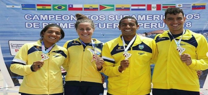 O Brasil colocou quatro atletas no pódio neste primeiro dia de prova da Maratona Aquática no Campeonato Sul-Americano de Desportos Aquáticos, disputado em Lima, no Peru. Nesta quarta-feira (31), Ana Marcela Cunha e Allan do Carmo foram os vencedores da prova de 5km. No pódio, eles tiveram a companhia de Viviane Junglut e Victor Colonese, que fecharam em terceiro e segundo, respectivamente a prova de seus naipes.