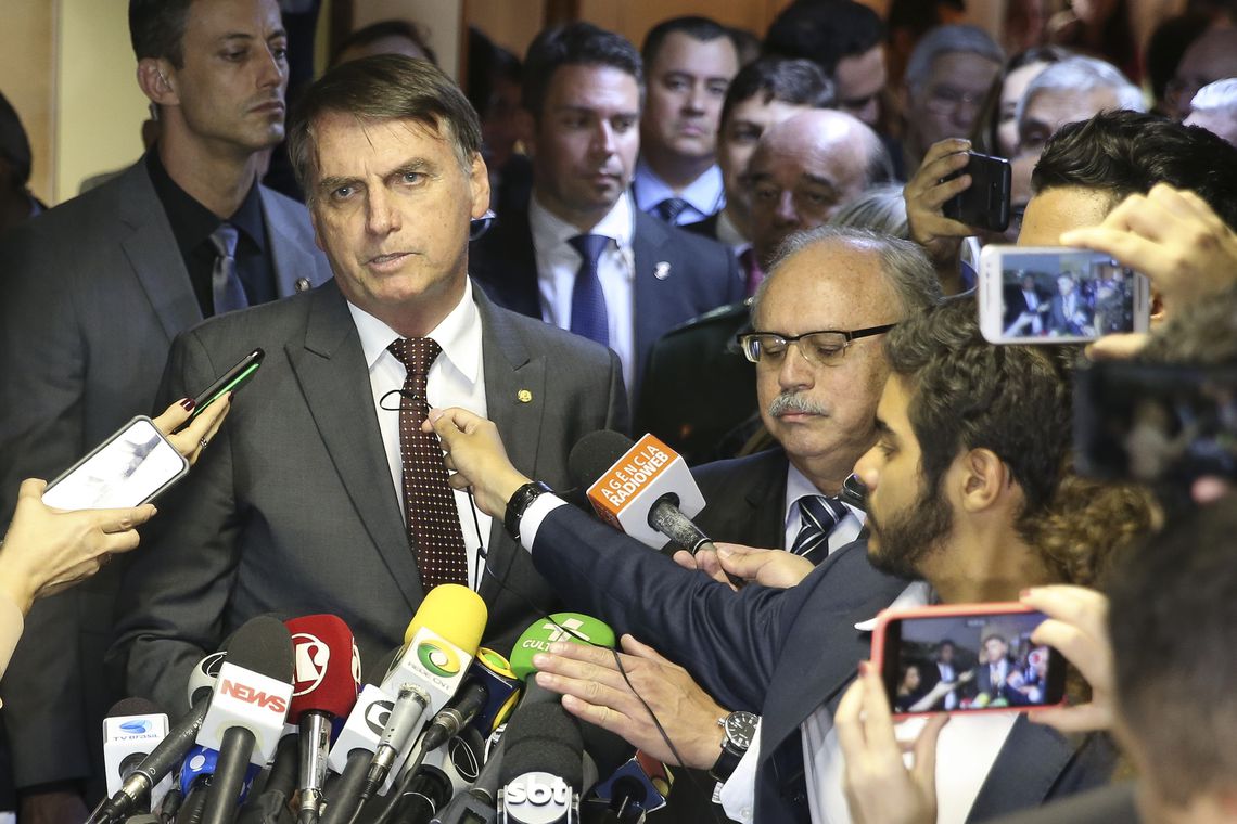 O presidente eleito Jair Bolsonaro fala à imprensa após encontro com o presidente do Superior Tribunal Militar (STM), José Coelho Ferreira, no STM, em Brasília.