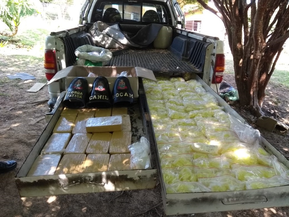 No fundo falso da Dodge Dakota e em outro veículo, um Fiat Idea, foram encontrados 17 tijolos de pasta base de cocaína, mais de 10 mil pinos de cocaína e cerca de 5.300 pedras de cocaína, além de itens para processamento e embalo das drogas.