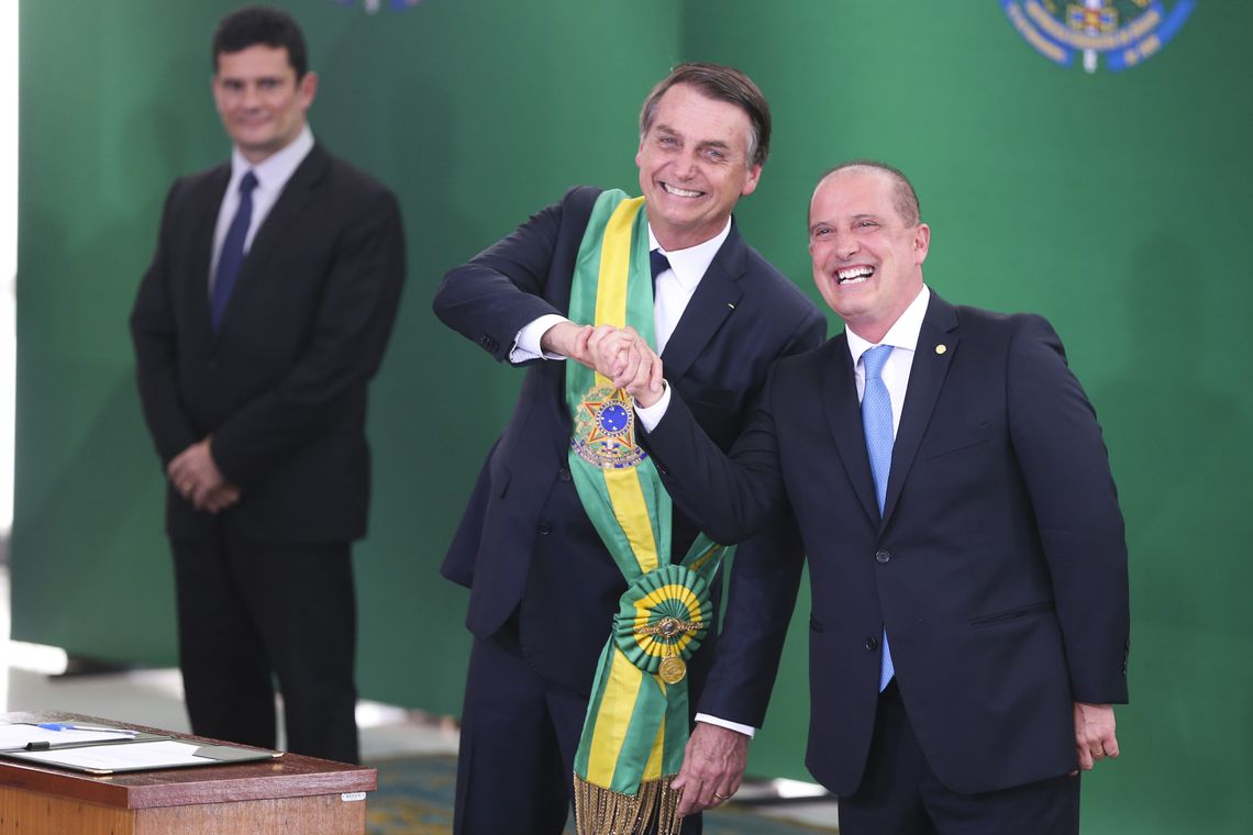 O presidente Jair Bolsonaro empossa o ministro da Casa Civil, Onyx Lorenzoni, durante cerimônia de nomeação dos ministros de Estado, no Palácio do Planalto.