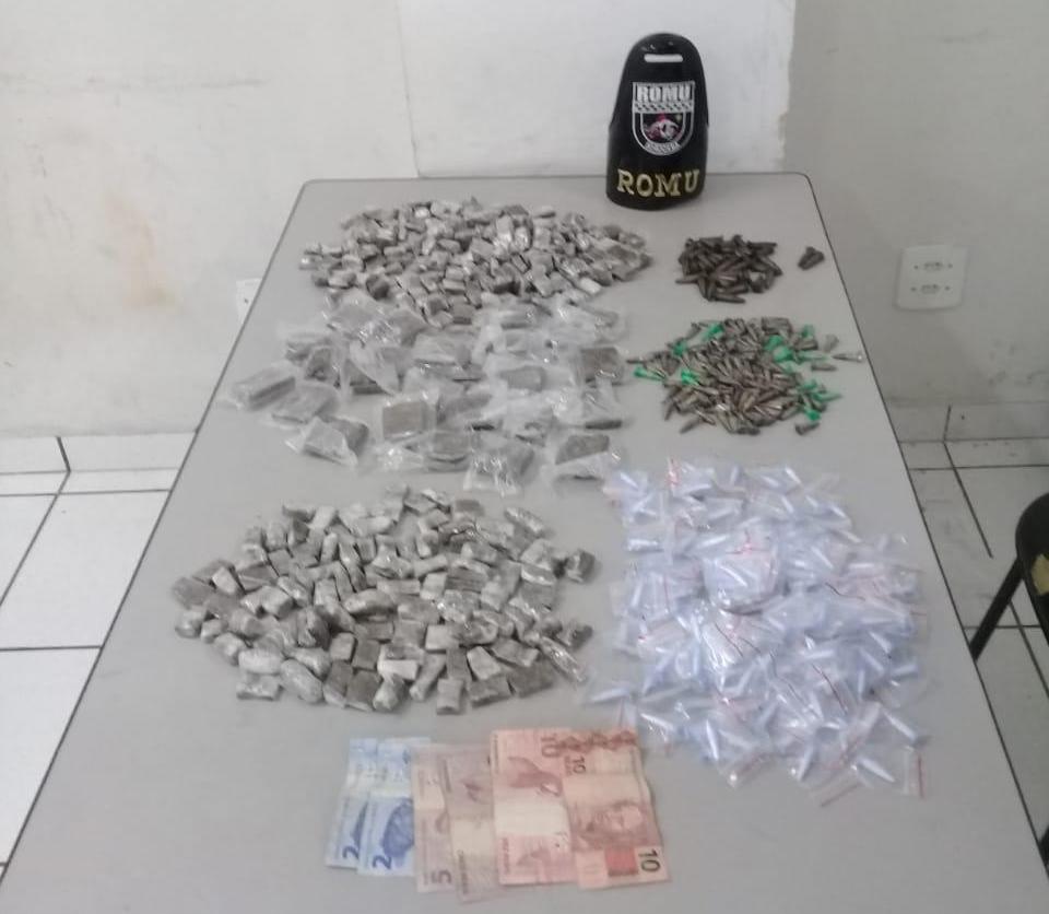 Após ser alcançando pela guarda, o jovem R.D.F, de 25 anos foi detido, portando uma pochete contendo 70 porções de cocaína, 36 de crack e 104 porções de maconha.