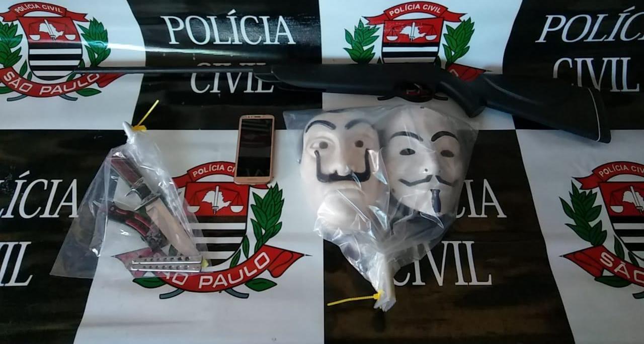 Diante disso, investigadores foram até a residência do menor e lá localizaram três facas, duas máscaras e uma espingarda de pressão.