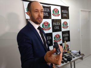 O delegado Rodrigo Ayres mostra um micro celular que seria levado a uma unidade prisional