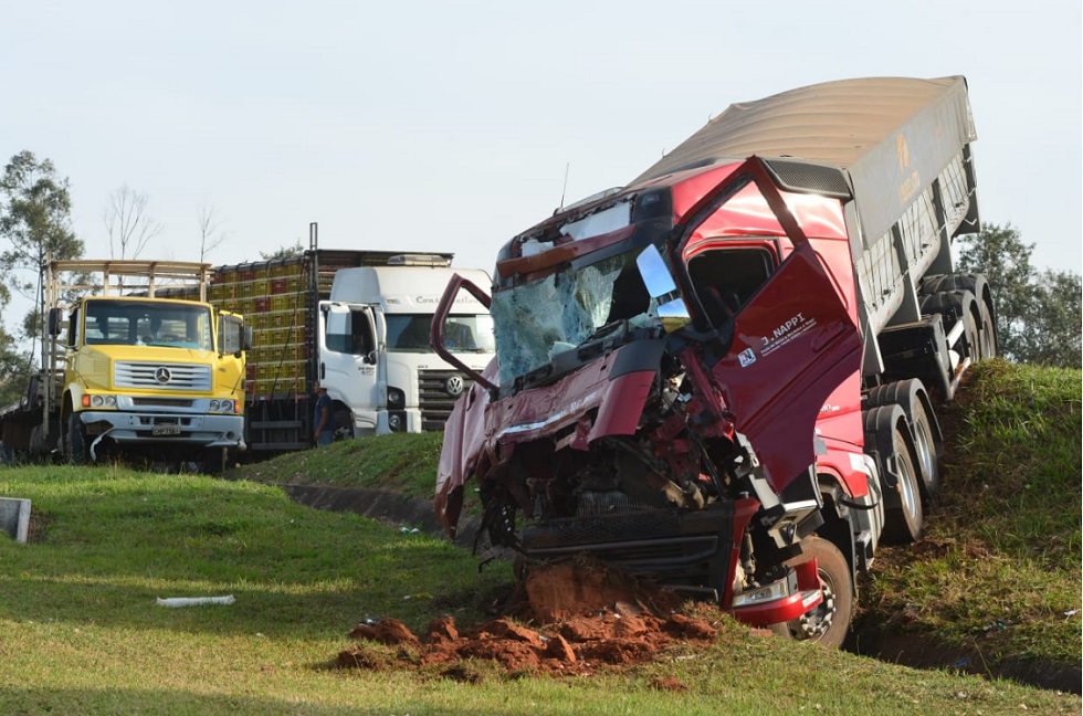 De acordo com a Polícia Rodoviária, um caminhão de pequeno porte carregado com frangos vivos estava parado na faixa da direita com problemas mecânicos. Um caminhão bitrem, que transportava bebidas, bateu na traseira do veículo estacionado.