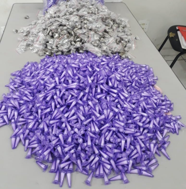 No local de onde o detido havia saído, foram localizadas mais 833 porções de maconha, 2.492 porções de cocaína, caderno de anotações da movimentação do tráfico, além de grande quantidade de material usado para embalar drogas.