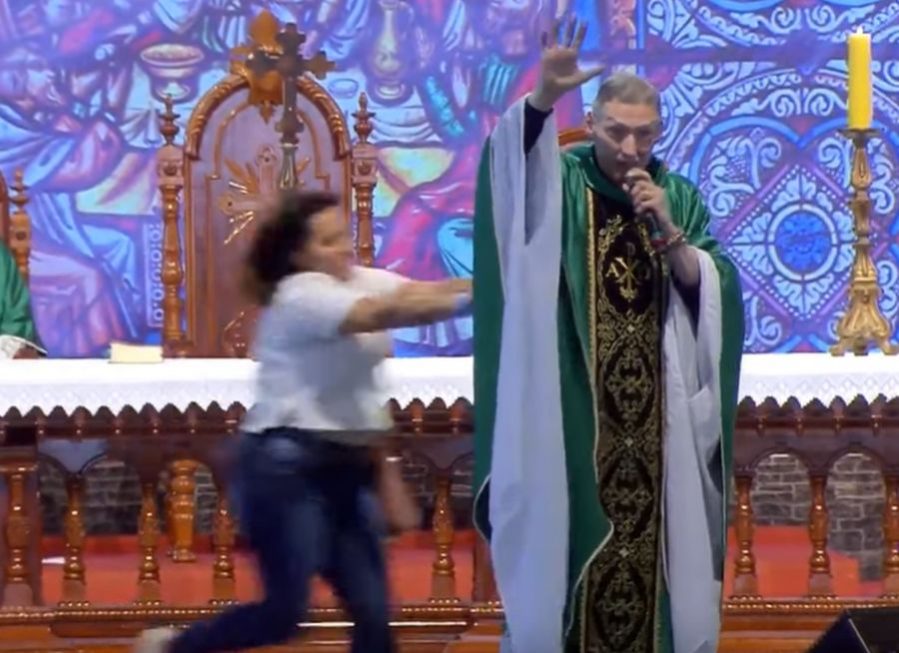 Durante missa celebrada em Cachoeira Paulista(SP), neste domingo(14), uma mulher se desvencilhou dos seguranças, invadiu o palco e empurrou o padre Marcelo Rossi do altar.