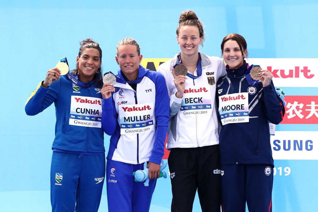 Ana Marcela Cunha é campeã dos 5km no Mundial de Esportes Aquáticos de Gwangju 2019. Nas águas de Yeosu na Coreia do Sul, a brasileira fez uma prova perfeita, administrando o ritmo no começo, apertando na segunda volta e com um forte sprint no final para bater em primeiro na chegada com tempo de 57:56:00.
