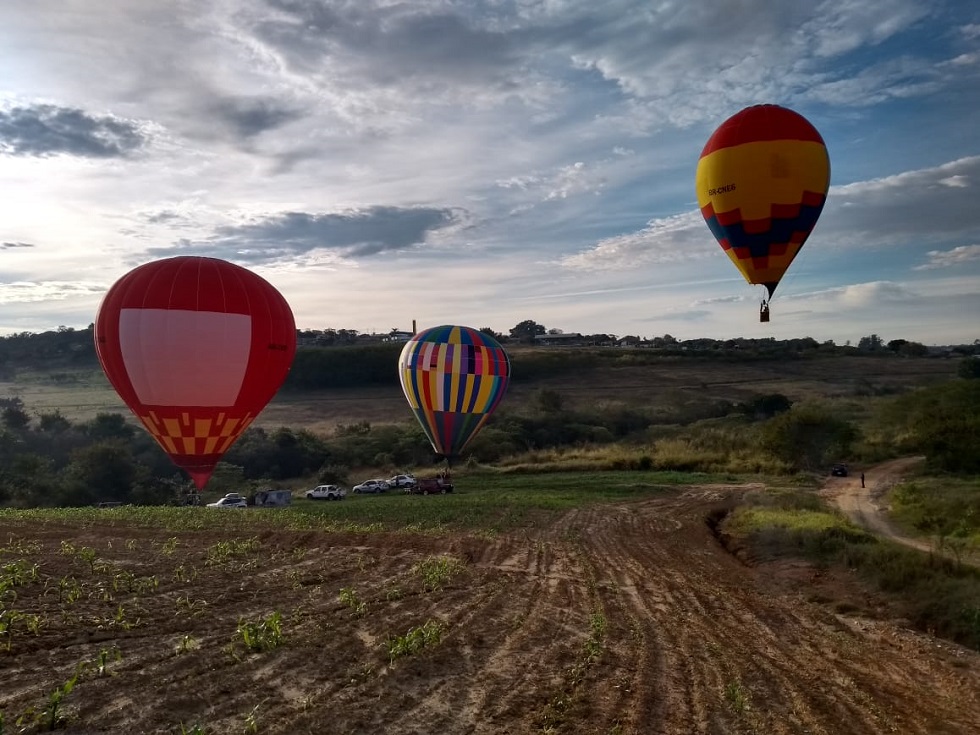 A decolagem de treinamento ocorreu no meio de uma plantação de cana-de-açúcar. Os pilotos analisaram o vento e escolheram o ponto para os balões passarem na direção dos alvos.