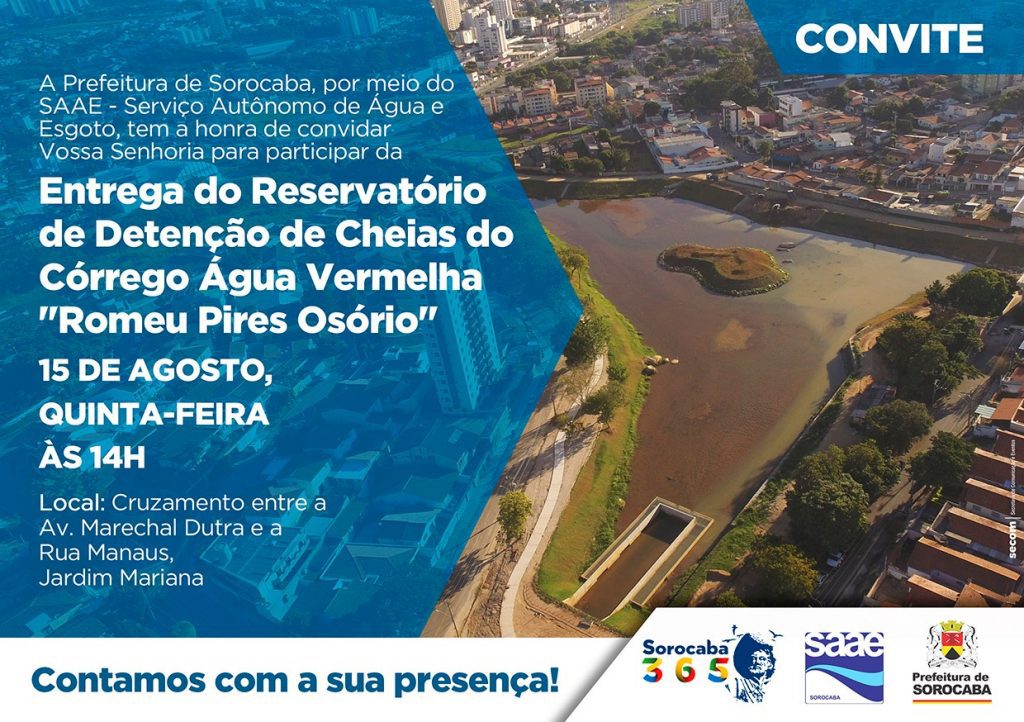 A Prefeitura de Sorocaba e o Serviço Autônomo de Água e Esgoto (Saae) entregam nesta quinta-feira (15), aniversário de 365 anos de Sorocaba, a segunda e última etapa das obras de implantação do Reservatório de Detenção de Cheias (RDC) do Córrego Água Vermelha, no cruzamento da Avenida Marechal Dutra e Rua Manaus, no Jardim Mariana, às 14 horas. Haverá exposição de animais empalhados da Secretaria de Meio Ambiente Parques e Jardins, adoção de animais, doação de mudas para a população, a partir das 13 horas.