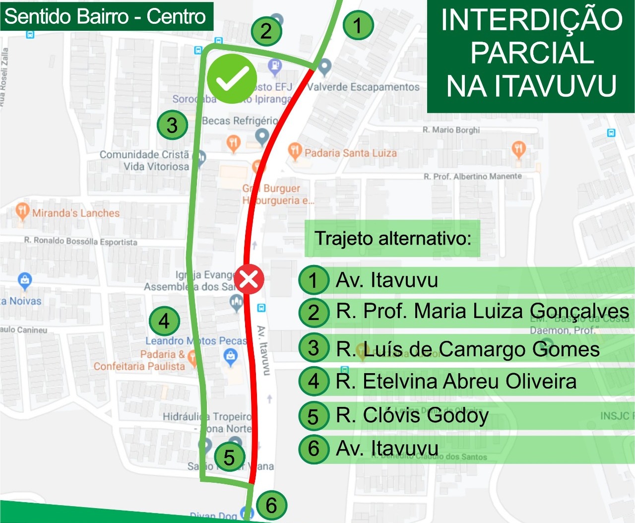 A Urbes orienta os motoristas a utilizarem o caminho alternativo formado de ruas paralelas à avenida Itavuvu, indicado no mapa que pode ser encontrado no site da Urbes e em nossas redes sociais.
