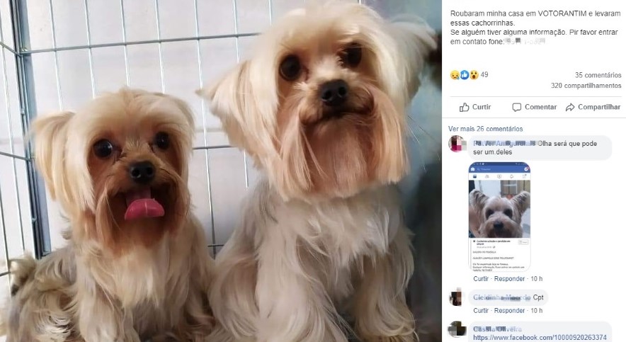 Após o furto, a aposentada fez um boletim de ocorrência na Delegacia de Polícia de Votorantim. Quem tiver informação sobre o paradeiro das duas cachorras pode entrar em contato pelo telefone (15) 99771-5821.