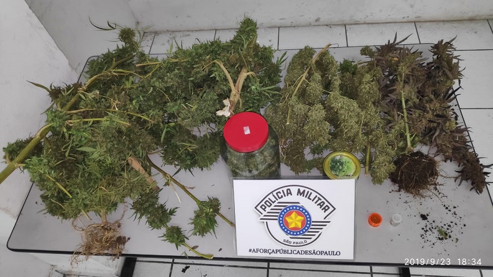 Segundo a PM, no quintal da casa foram encontrados quatro pés de maconha. Já no interior da residência, havia a erva já seca, pronta para ser comercializada. Também foram apreendidas sementes da planta.