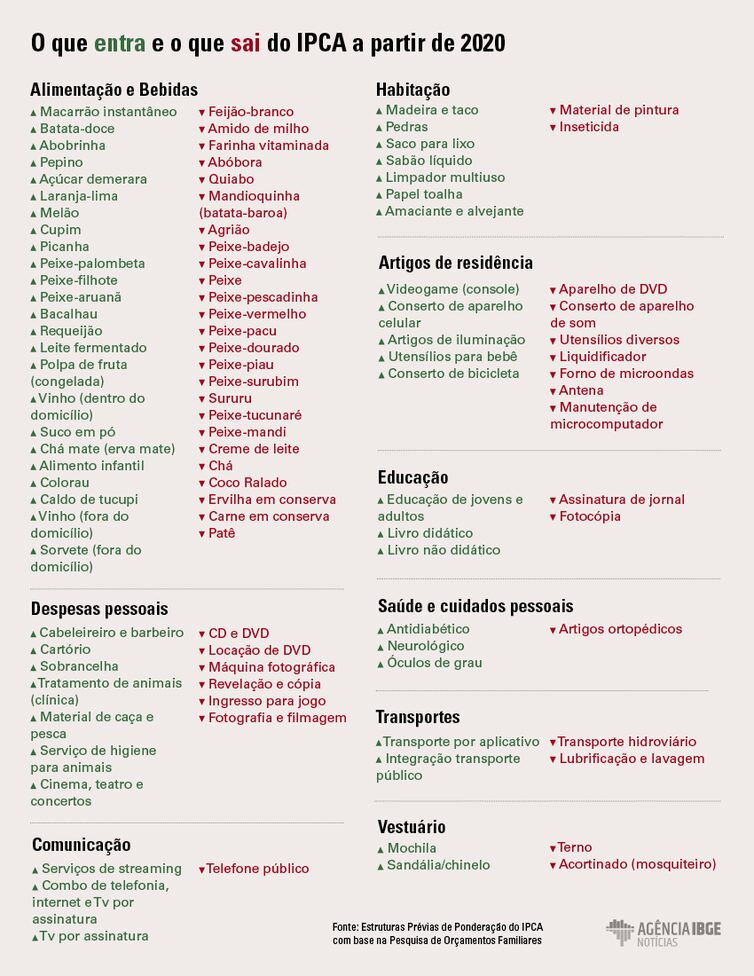 A mudança do cálculo do IPCA será feita devido à divulgação, na semana passada, da Pesquisa de Orçamentos Familiares (POF) 2017-2018, a qual avalia o peso de cada gasto dentro do orçamento das famílias brasileiras. Atualmente, o cálculo do IPCA é feito com base na POF 2008-2009.