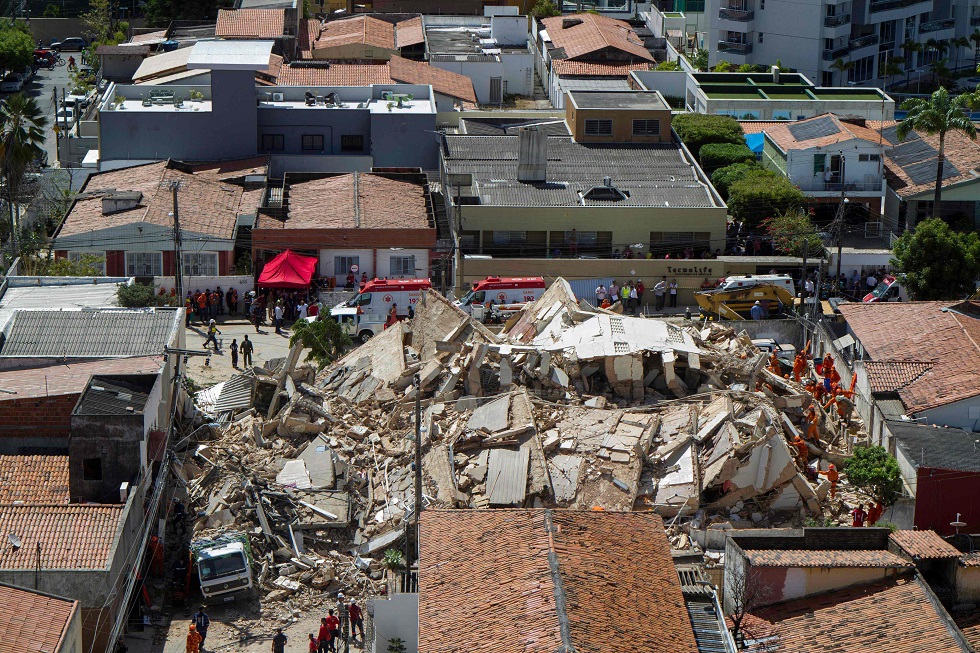 Firefighters search among the debris of the seven-floor residential building collapsed earlier today in Fortaleza, Ceara state, northeast of Brazil, on October 15, 2019. At least one person was killed when a seven-story residential building collapsed in Brazil on Tuesday, an official said, as rescuers searched through the rubble for survivors. / AFP / RODRIGO PATROCINIO