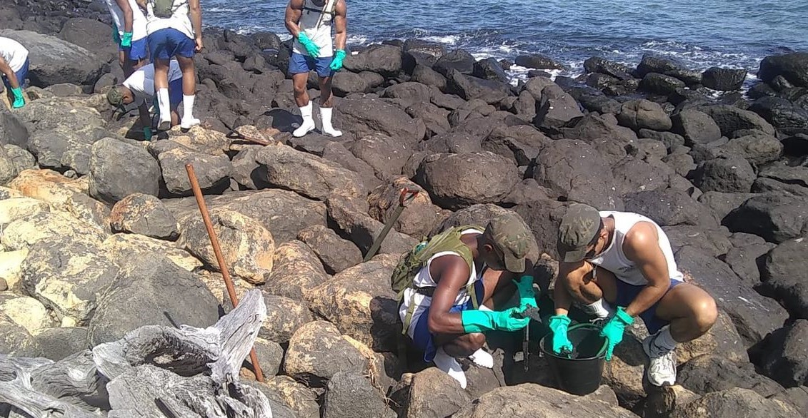 Região do arquipélago baiano de Abrolhos (BA), operações de monitoramento e limpeza de áreas atingidas pelas manchas de óleo.