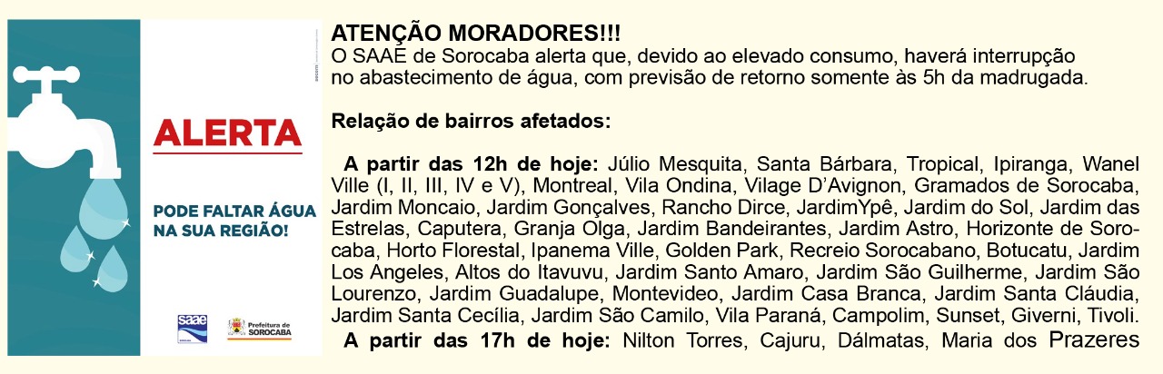 O Serviço Autônomo de Água e Esgoto (Saae) de Sorocaba alerta que 45 bairros de todas as regiões da cidade (Oeste, Leste, Sul e Norte) poderão ter falta de água a partir das 12h desta segunda-feira (4) por causa do alto consumo.