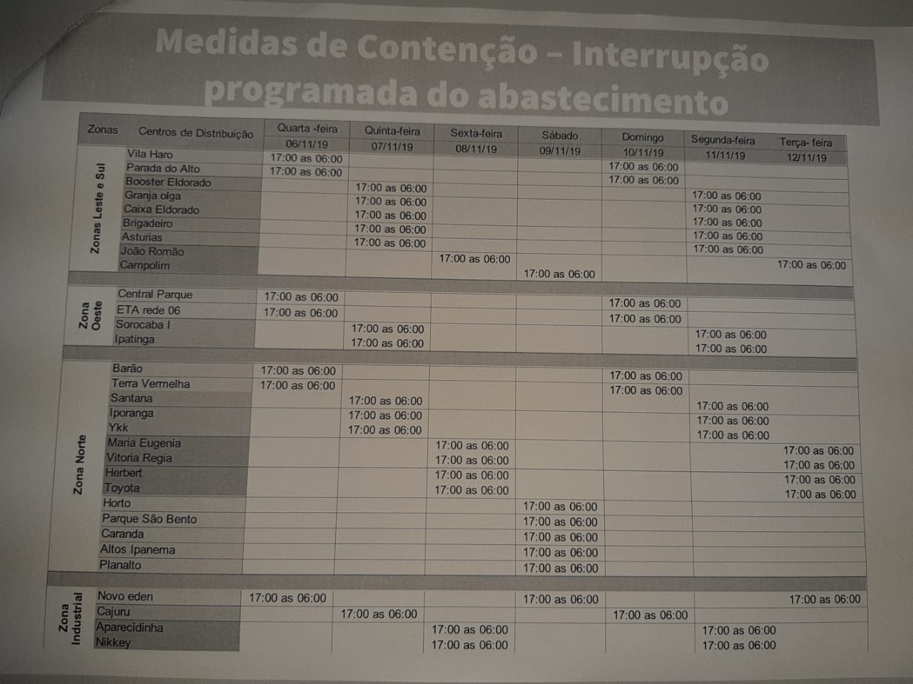 A programação de corte no abastecimento está no quadro abaixo.