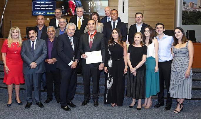 O secretário estadual de Habitação, Flávio Amary, foi homenageado com a Comenda Referencial de Ética e Cidadania em sessão solene da Câmara Municipal de Sorocaba, realizada na noite desta segunda-feira (4), 4, por iniciativa do vereador Fernando Dini (MDB), presidente da Casa.