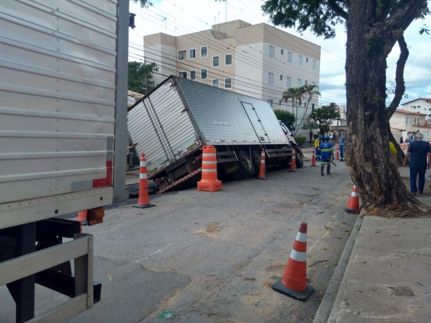 Um caminhão-baú foi ‘engolido’ após o asfalto ceder na rua Inglaterra, no Jardim Europa, em Sorocaba. No local há uma obra do Serviço Autônomo de Água e Esgoto (Saae).