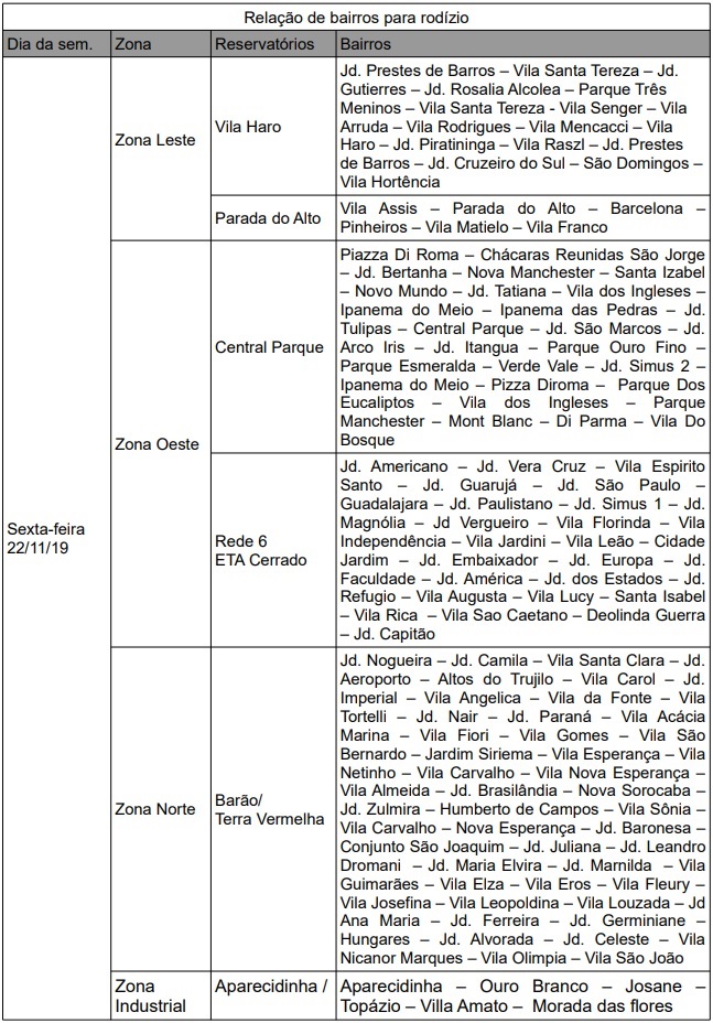 Veja os bairros atingidos pelo rodízio: