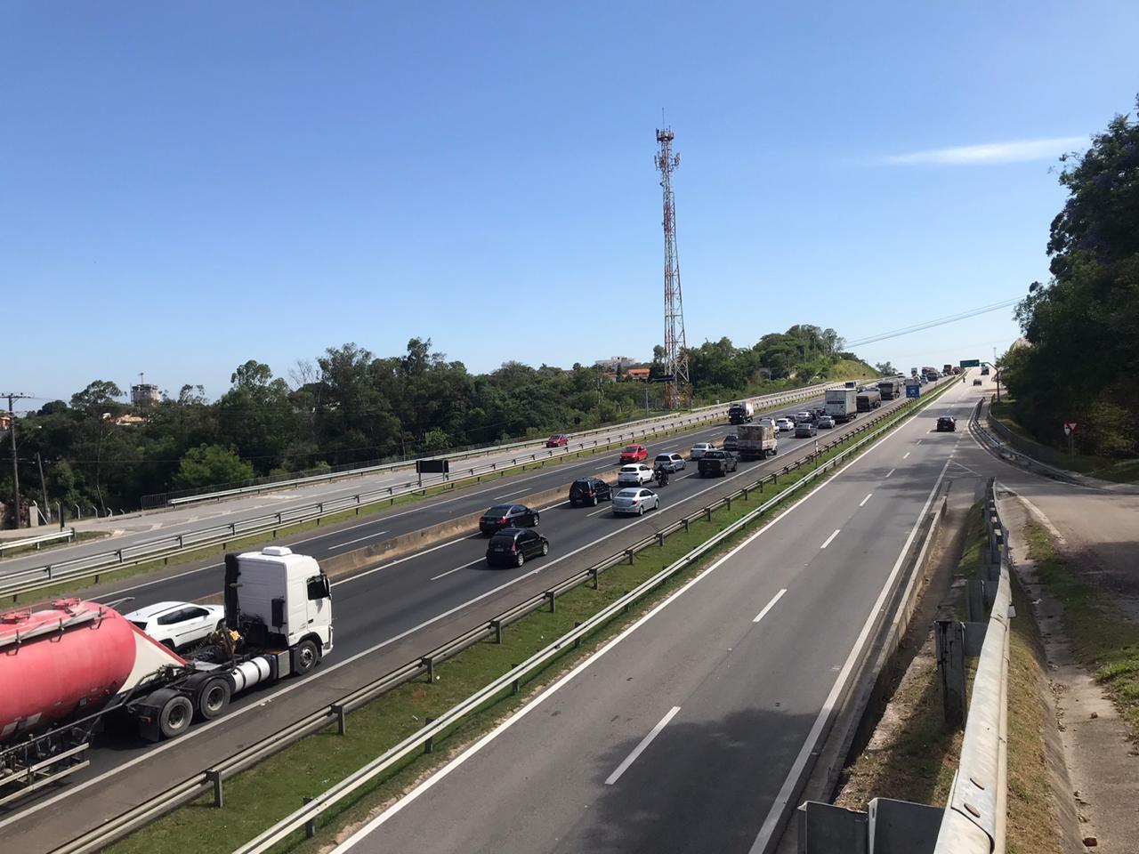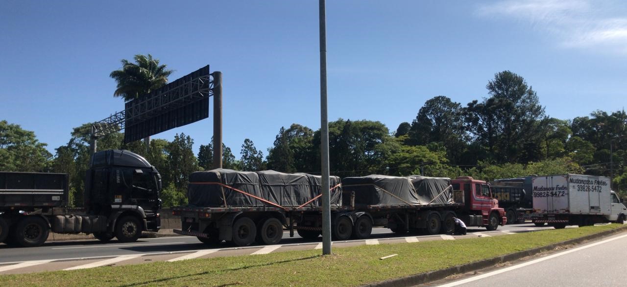 O veículo quebrou no início do trecho de subida, na faixa da direita, que está interditada para a retirada da carreta pelo guincho da concessionária CCR Via Oeste.