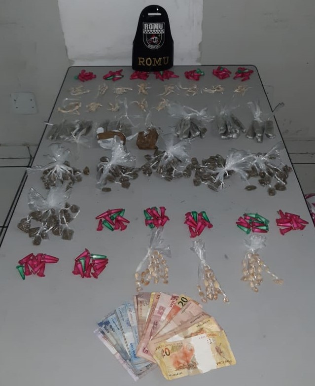 Em revista pessoal a G.S.M. de 19 anos, foram encontrados dentro de uma pochete que o suspeito carregava: 130 porções de crack, 70 porções de cocaína e R$ 234,00. Na sacola plástica havia 223 porções de maconha, 78 porções de crack, 70 porções de cocaína e 02 porções de Skank.