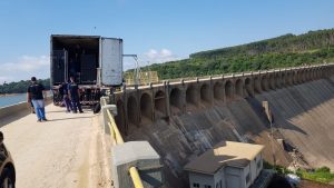 Carreta da equipe de Michel Teló fica "entalada" na ponte sobre a barragem de Itupararanga