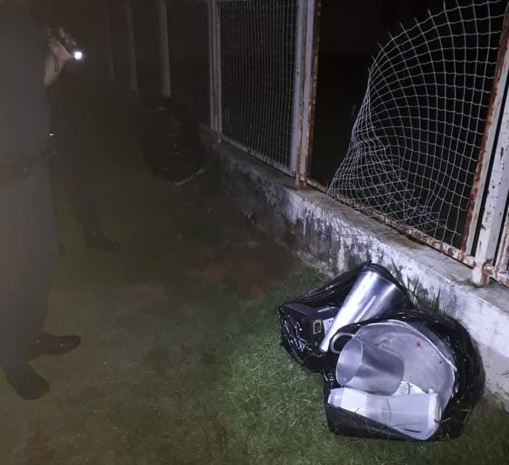 No local, os guardas se depararam com o alambrado estourado e perto dele encontraram dois sacos pretos cheios de utensílios de cozinha pertencentes à unidade escolar. Uma vidraça do prédio também estava quebrada.