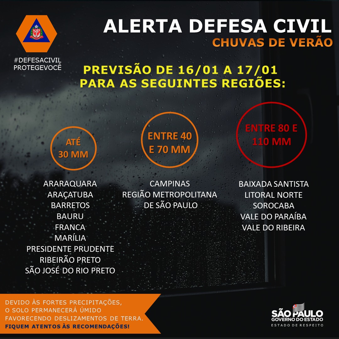 As regiões mais críticas, segundo o órgão, serão o Vale do Ribeira, Vale do Paraíba, Litoral Norte, Baixada Santista, Grande São Paulo, Sorocaba e Campinas.