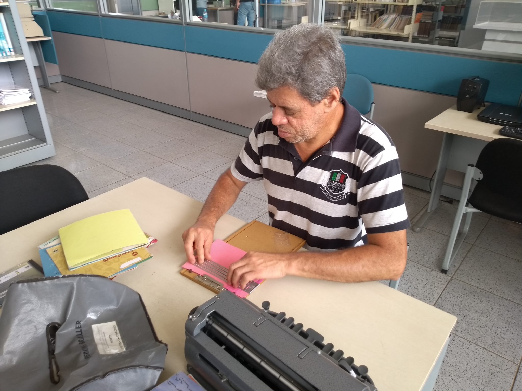 Loniel Leal das Neves Júnior é deficiente visual desde os 16 anos de idade e atua no setor da Biblioteca Braille, dentro da própria Biblioteca Municipal.