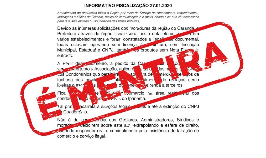 A Secretaria Municipal de Comunicação informou no final da tarde desta segunda-feira (27) que é falso e sem qualquer fundamento um “Informativo de Fiscalização” distribuído ontem às pessoas que exercem algum tipo de comércio na região dos Residenciais Carandá e Altos do Ipanema.
