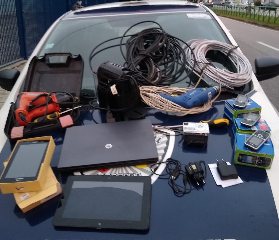 O detido, de 31 anos, possui passagem por furto e estava pronto para fugir com uma furadeira, uma parafusadeira, chaves de fenda, alicate, fios elétricos e, no momento da abordagem, foi localizado em sua posse três celulares, dois tablets, um notebook e uma cafeteira. Também foram constatados alguns armários estourados.