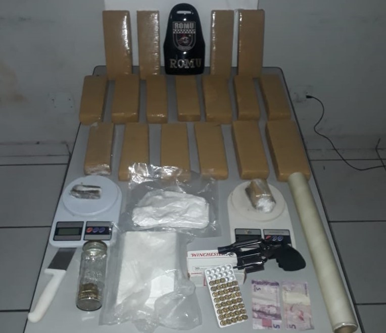 O material foi apreendido e encaminhado ao Plantão Policial Norte. O acusado foi autuado por tráfico de drogas e porte de arma de uso restrito. O outro jovem foi ouvido e liberado.