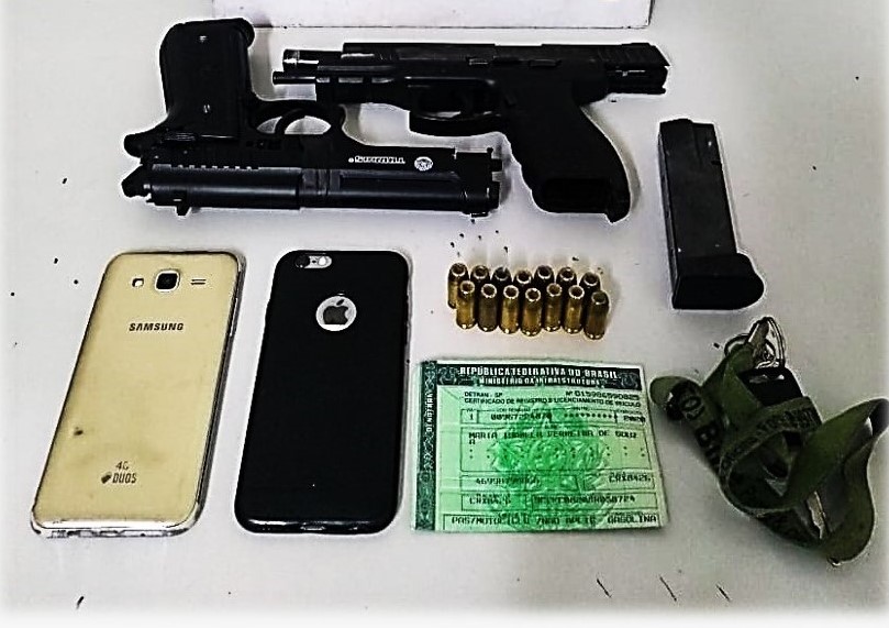 Um celular roubado momentos antes e um simulacro de arma de fogo utilizado pelo infrator foram encontrados pelos policiais.