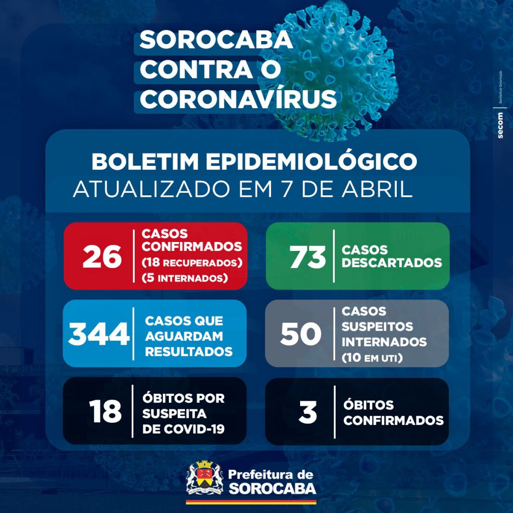 Nesta terça-feira (07), a Prefeitura de Sorocaba, por meio da Secretaria da Saúde (SES), registrou um novo caso confirmado da COVID-19. Com isso, já são 26 casos confirmados na cidade. Deste total, cinco estão internados (quatro em UTI) e 18 já se encontram recuperados. Além disso, três óbitos foram registrados por conta da doença.
