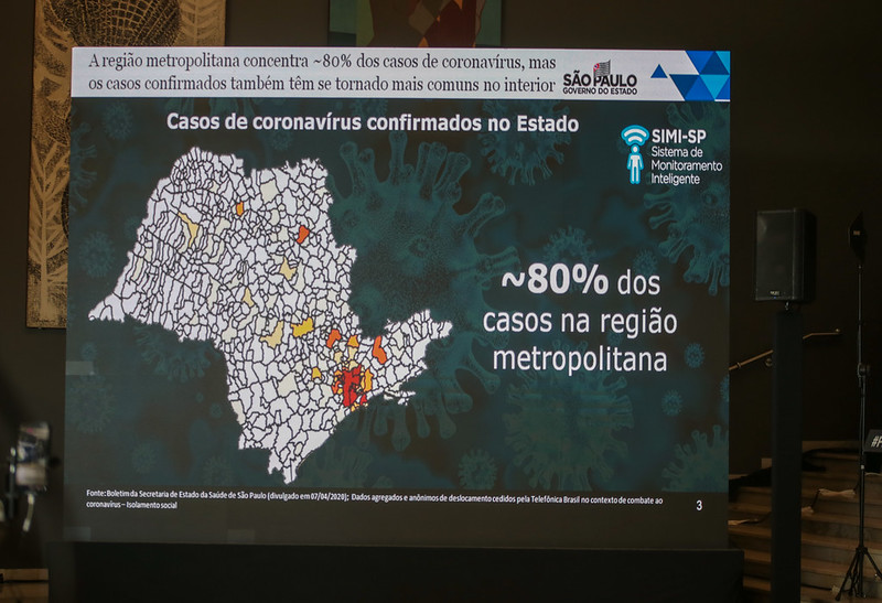 “Com 100% dos usuários de telefonia celular em São Paulo, nós podemos identificar os locais onde as pessoas estarão e onde houver concentração para analisar o percentual de isolamento e também ações de orientação e advertência, se necessário”, afirmou o Governador.