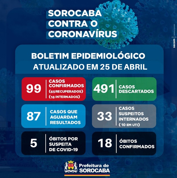 Subiu para 491 o número de resultados negativos de coronavírus em Sorocaba. A informação consta no boletim divulgado pela Prefeitura neste sábado (25).