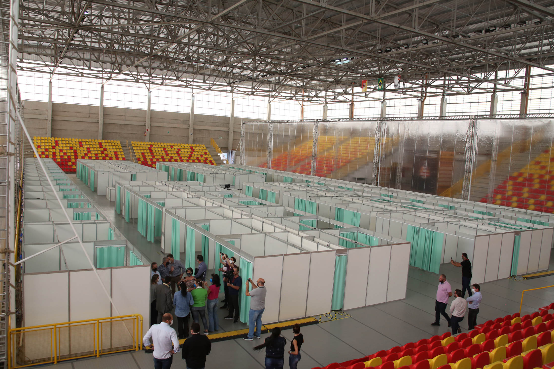 A comissão especial de vereadores que acompanha as ações de enfrentamento ao Covid-19 no município esteve mais uma vez na Arena Multiuso vistoriando a instalação do hospital de campanha. Com estrutura pronta, mas ainda sem equipamentos, os 84 leitos do hospital poderão ser utilizados, gradualmente, caso a taxa de ocupação das demais unidades (UPH Zona Leste e Santa Casa) alcance 75%. A partir de então os leitos serão disponibilizados em blocos, incialmente com 20 vagas.