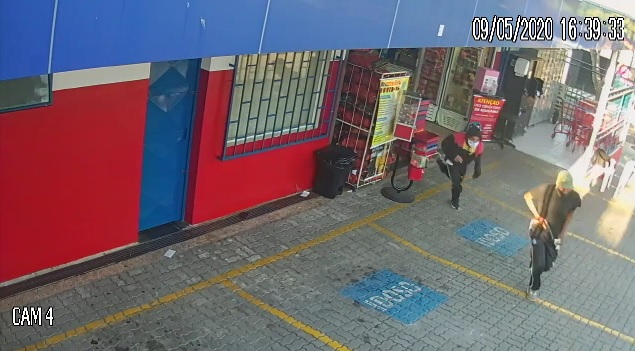 A ação foi registrada por câmeras de segurança. Pelas imagens, é possível ver que os homens saem de dentro do estabelecimento e rendem inicialmente dois colaboradores. Depois, começam a abordar também pessoas que faziam compras no local.