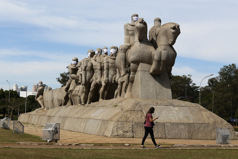 Durante este mês de maio, 16 monumentos e estátuas espalhados pela cidade de São Paulo ganham máscaras de proteção para conscientizar a população sobre a importância de usar a peça para se proteger contra o novo coronavírus, causador da doença COVID-19.